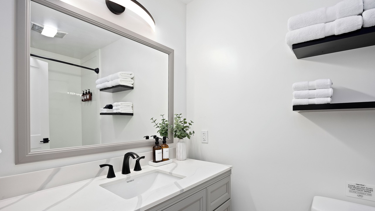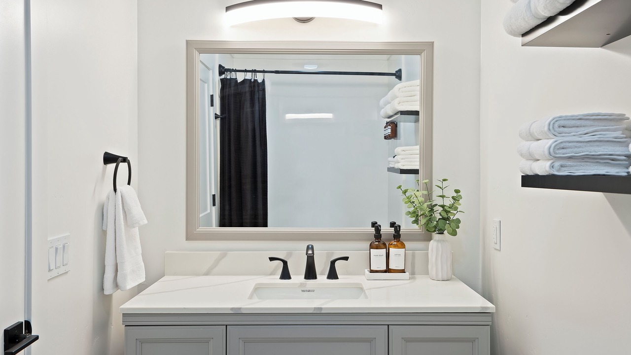 There is one full bathroom, ideal for beginning your day with a refreshing shower or ending your day after a long day of work. It is located across the hall from the 2nd bedroom. Bathroom is equipped with linens, lotion, shampoo, conditioner, body wash, as well as a hairdryer, so you won't need to worry about bringing your own.