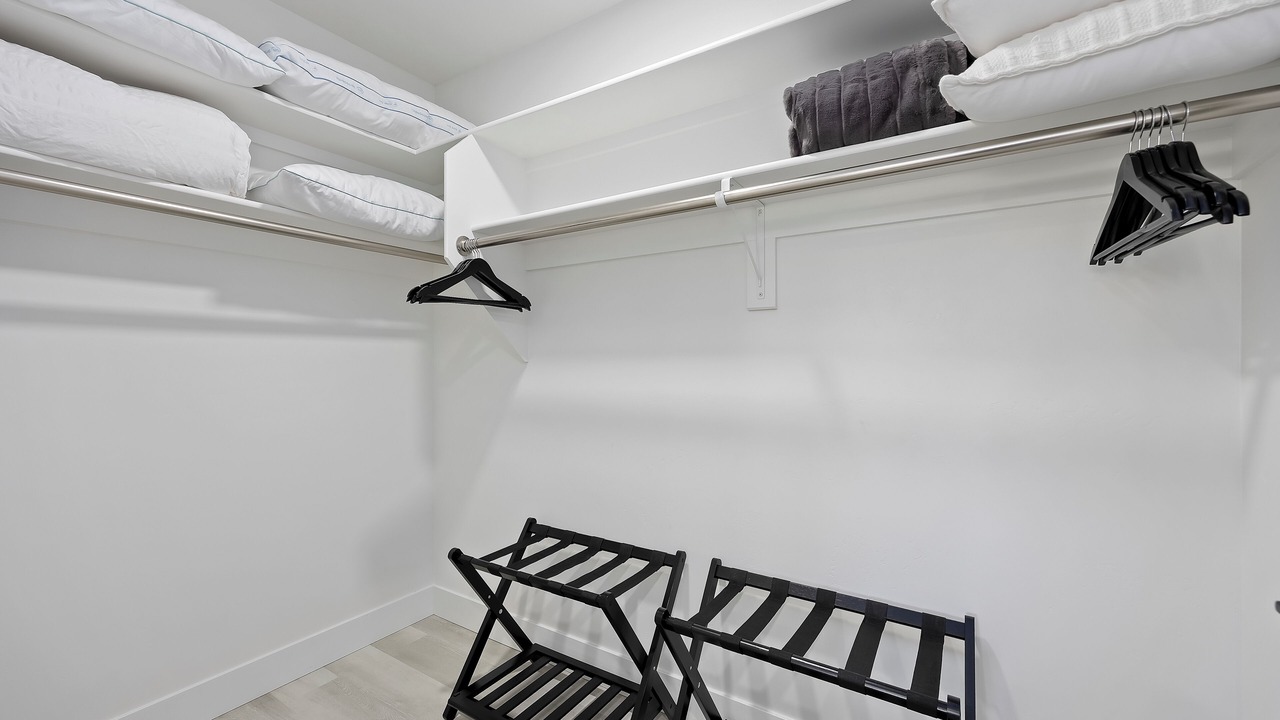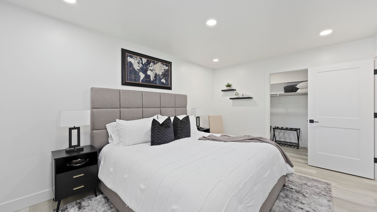 Each bedroom is decorated with modern furnishings and clean details to enhance your experience and stay. The master bedroom features a king-sized bed, while the second bedroom offers a double bed. Both beds are made with premium quality linens for a wonderful nights sleep. Both rooms are equipped with two nightstands, lamps and iPhone chargers and both offer a roomy closet space with luggage racks, and extra pillows and blankets.