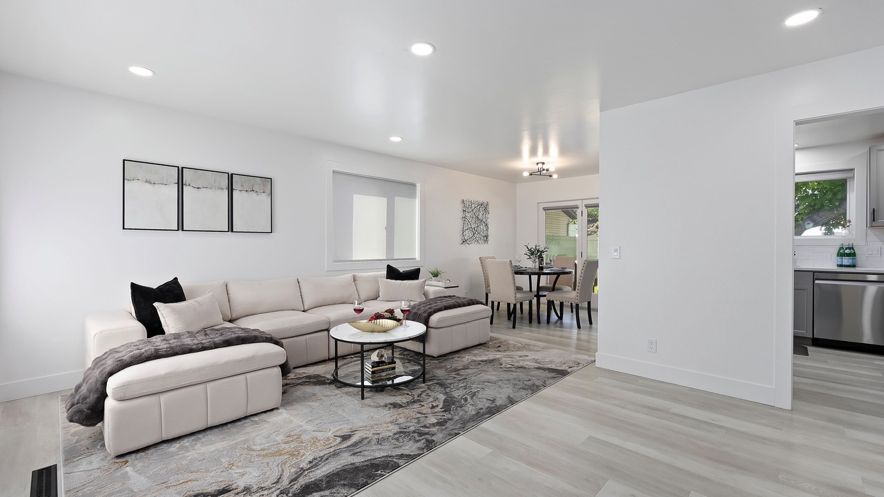 Immerse yourself in this stylish living room, featuring a stunning 65" smart TV with a bright and clear screen color and a large, comfortable sofa.