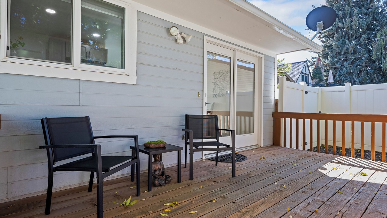 As you enter the back door from the dining area you will find two chairs and a side table on the deck. Enjoy your morning coffee, take in some morning sunshine and fresh air or enjoy some beverages in the evening. Delight in the privacy of a spacious fenced backyard and manicured lawn.
