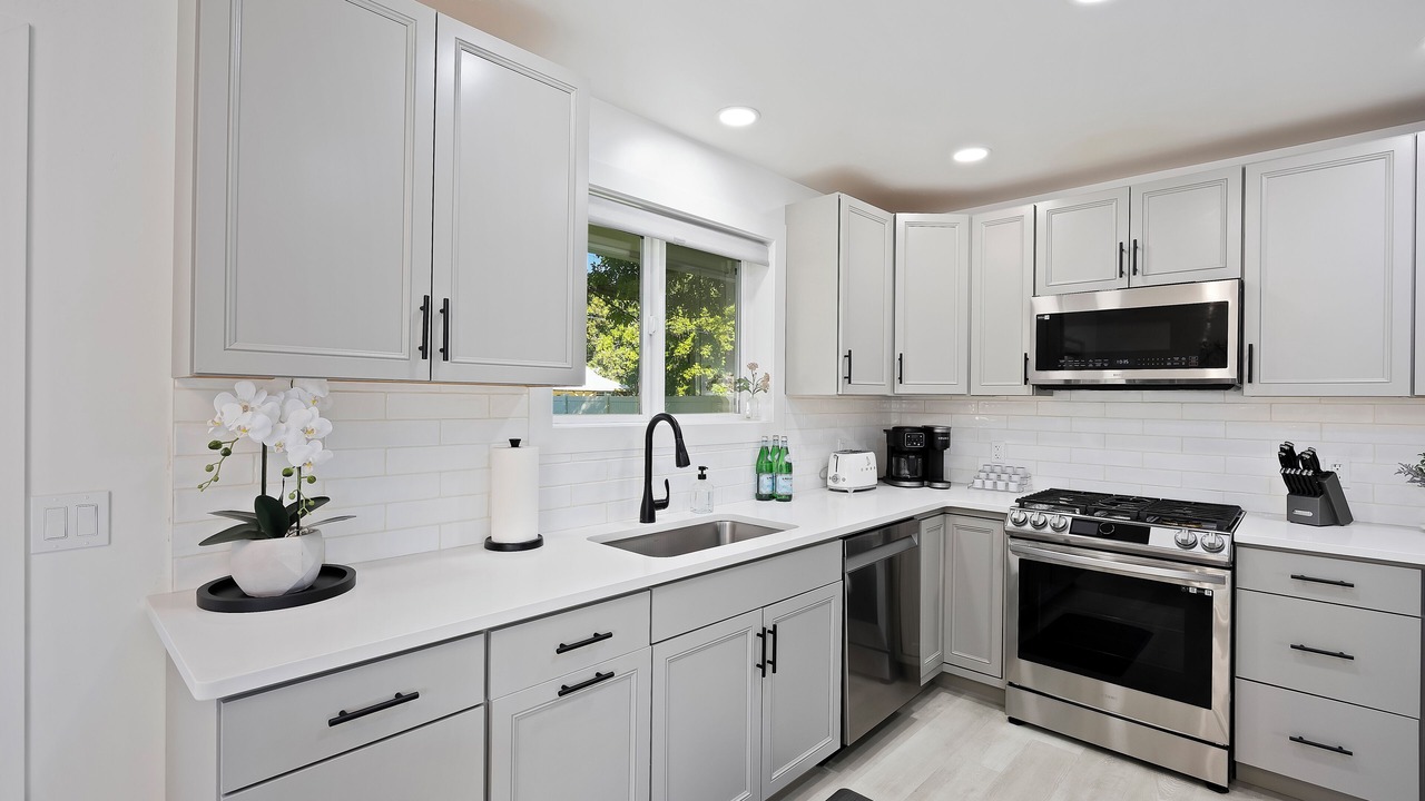 -Open kitchen that is equipped with all the necessities, featuring quartz countertops and stainless steel appliances