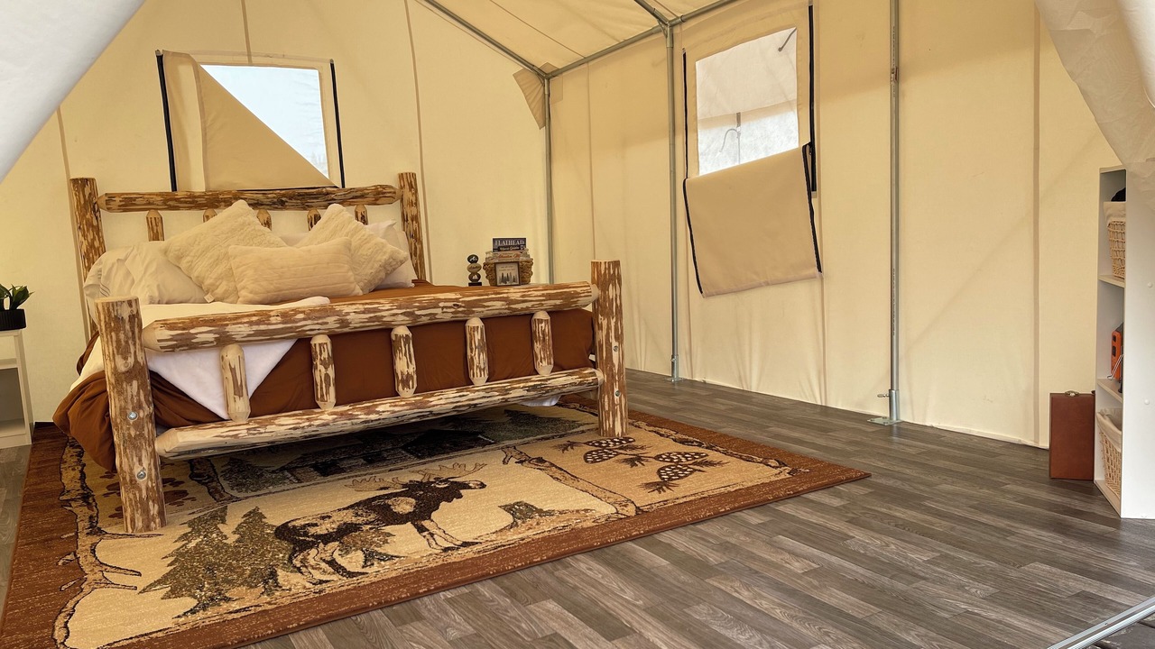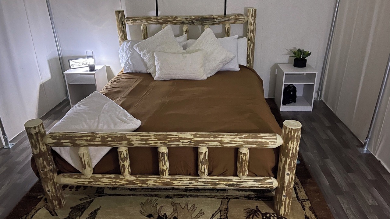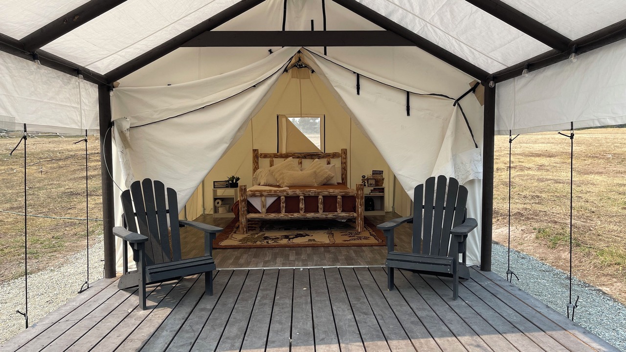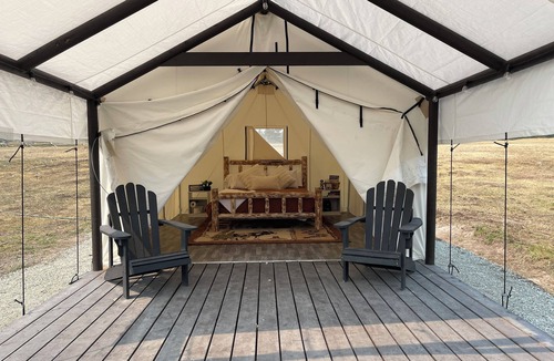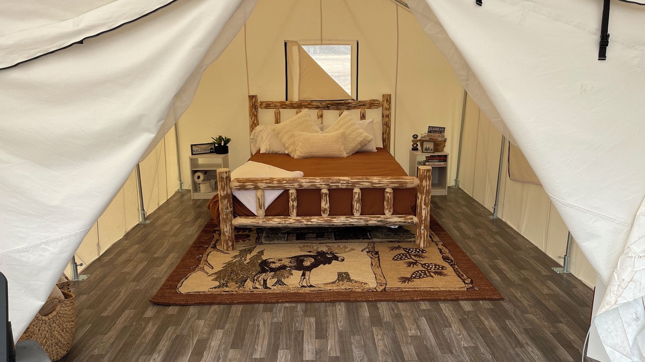 Be our guest in the Moose Tracks glamper. The tent includes a queen size bed and simple furnishings. For extra comfort there are plenty of blankets for the cool nights and a fan for the hot ones. Tent has a nice covered porch with seating for 2 that overlooks the river area and mountains behind it. ****** NEW THIS YEAR***** Full bathhouse with flushing toilets and indoor showers and power to plug in whatever you may need!!