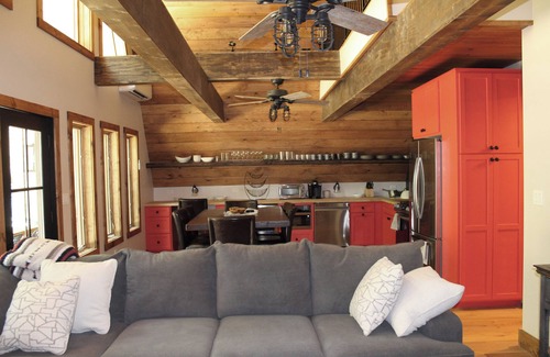 Inside the home you will find a warm and cozy environment with convenient amenities to satisfy all your needs, including luxurious and comfortable lounge seating around the gas stove in the family room, high top dining table, work area, and coffee and bar station all included in the kitchen. The small library loft contains a unique lounging and reading experience. The two main level bedrooms are appointed with king beds and have easy access to the front entrance of the home. The upstairs bedroom is equipped with two sets of custom built-in bunk beds. Twin beds on the top with double beds on the bottom. Well appointed bathrooms can be found on both the main level and upstairs level.