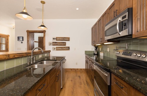 Rugged natural materials blend with sleek, sophisticated touches for an aesthetic alpine escape inside this 3-level home. The first floor hosts the main living areas and an open floor plan for flowing conversation and entertainment The chef’s kitchen features dark stone countertops, a sage green backsplash, and rich wood cabinets. Imagine quiet mornings whipping up eggs and pancakes to fuel the day or lively evenings enjoying drinks at the breakfast bar for 4. Adjacent is an 8-seat dining table for mealtimes and friendly board games. A timeless flagstone fireplace with an extended hearth bench is the centerpiece of the living space. Sink into the soft sectional—piled with pillows and blankets for extra comfort—and enjoy fire-lit nights watching TV. Outside, savor the fresh mountain air from the privacy of a fence and covered patio, replete with rocking chairs, a firepit, strung lights, a gas grill, and a hot tub.