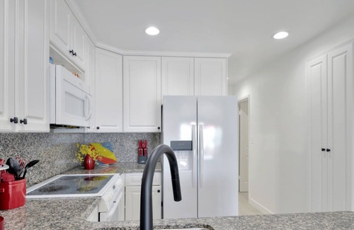 This is a newly remodeled condo with a new kitchen, flooring, bathrooms, appliances, and furniture.