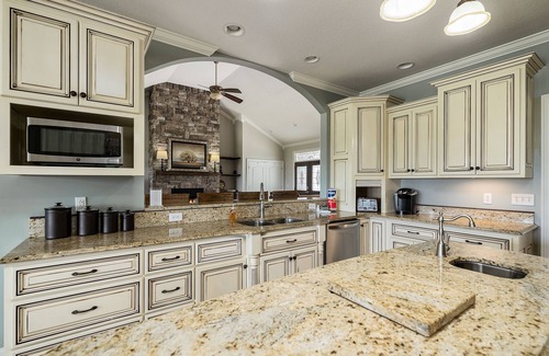 Stay warm on chilly evenings with gas logs in both living rooms, the master bedroom, and one of the queen bedrooms. Ceiling fans throughout the house keep you comfortable year-round.
