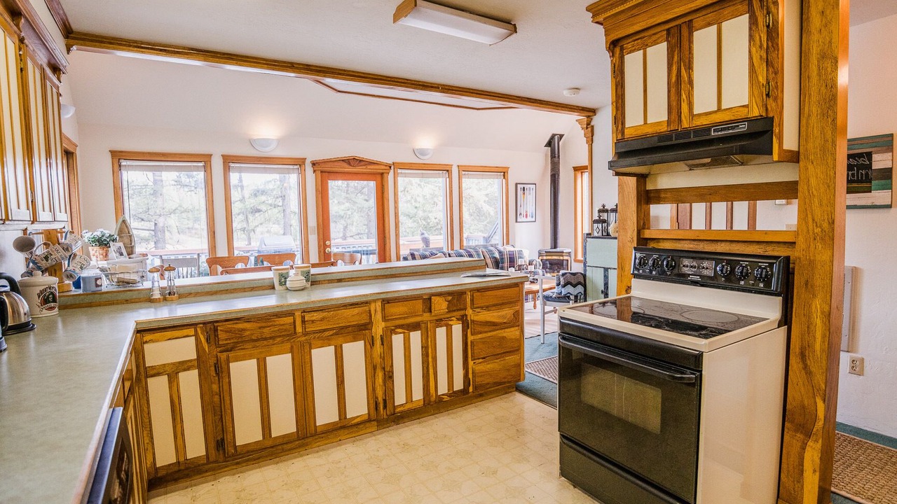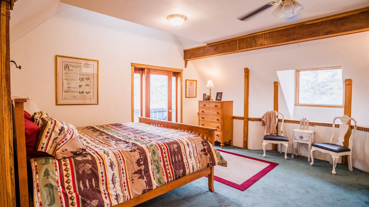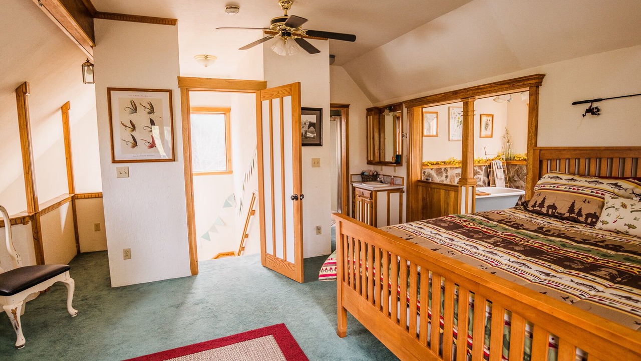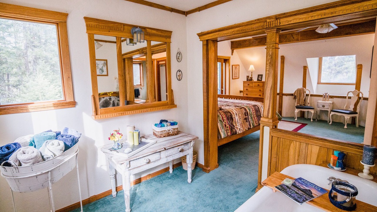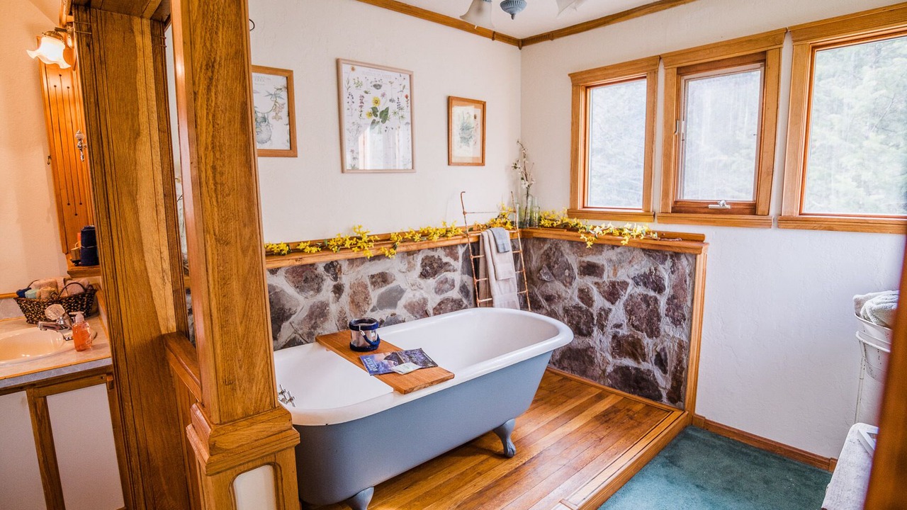 Pamper yourself in the spacious and beautiful master suite located on the upper floor. It features an antique claw foot bath tub, a balcony, and mountain views. Enjoy the tranquility and peacefulness surrounding you while you sit and soak in a relaxing bath.