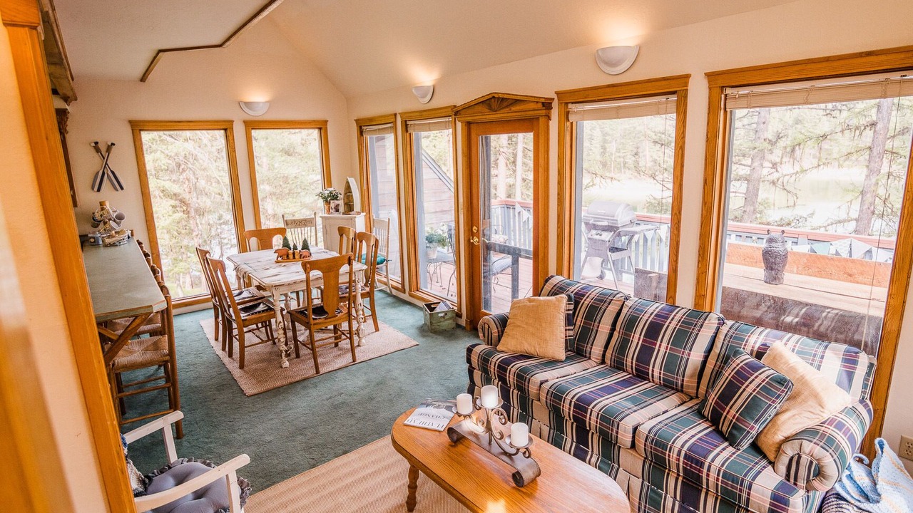 The bright living room on the main floor with its attached deck and numerous, oversized windows offers ample opportunity to enjoy spectacular views of the lake against the backdrop of the beautiful Swan Mountain Range.