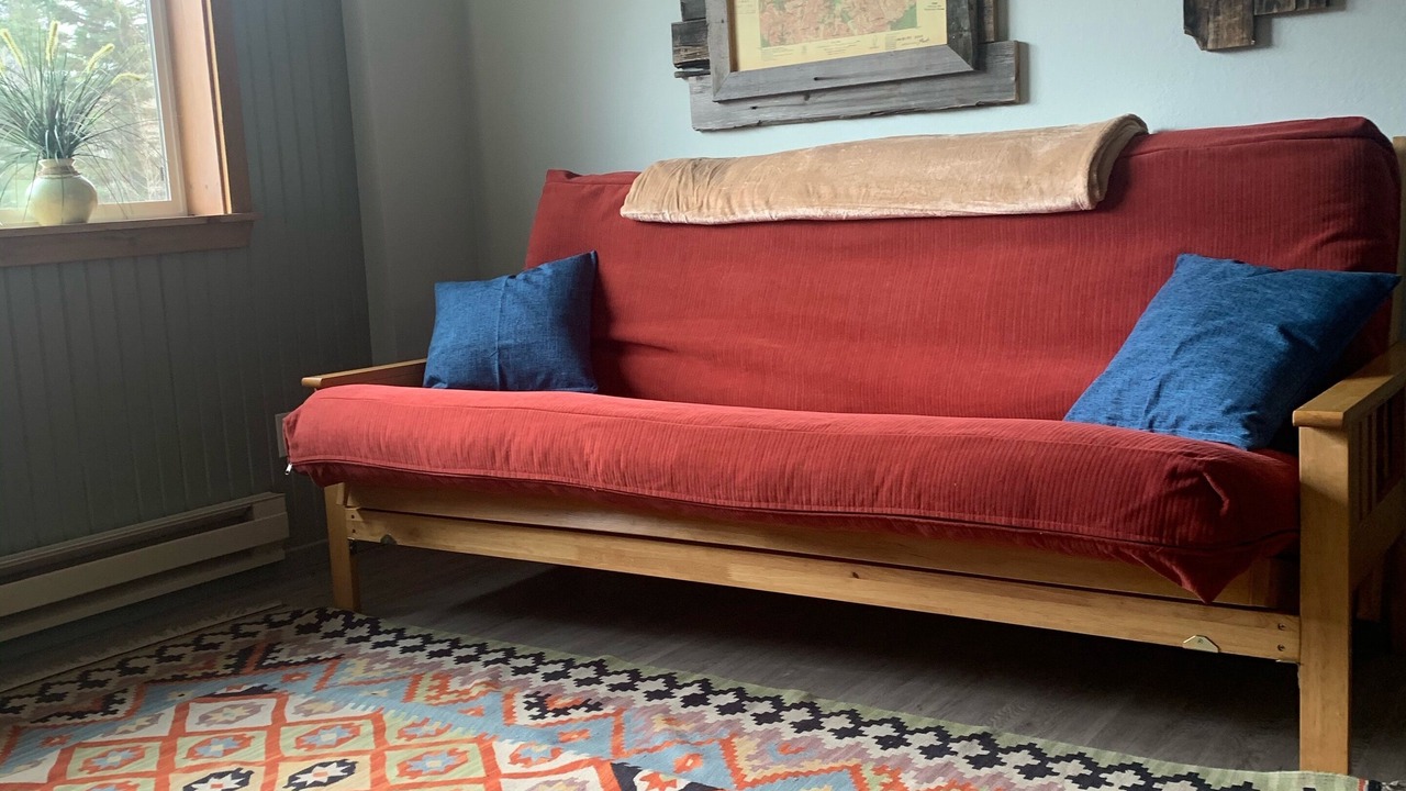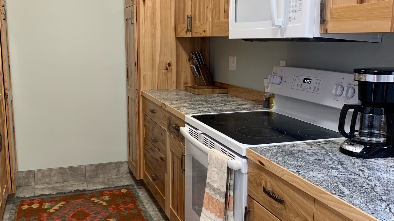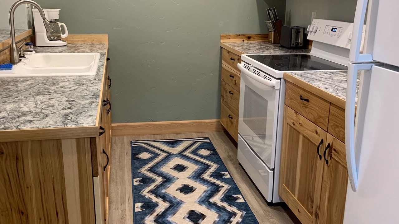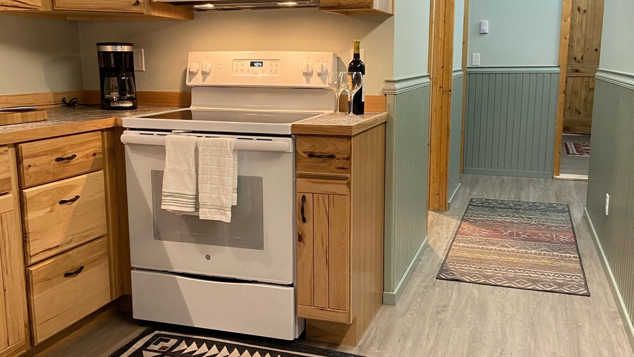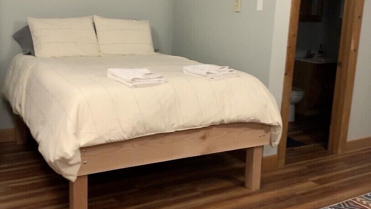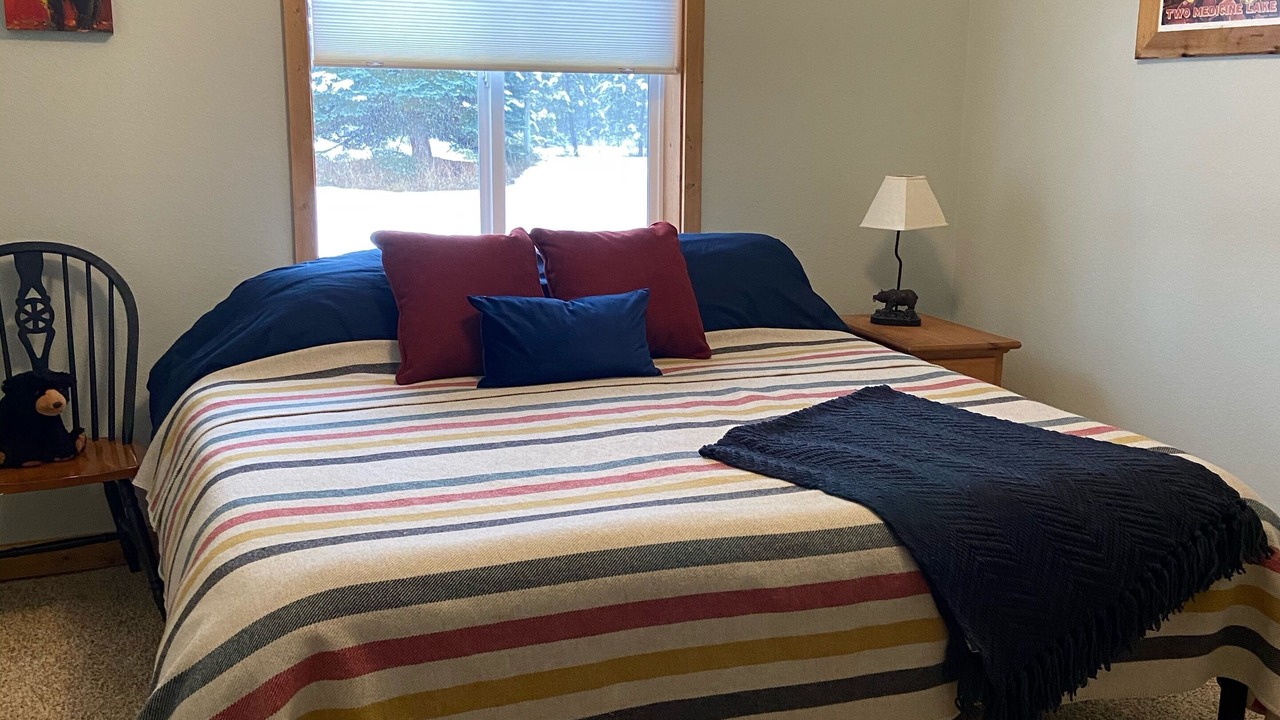 Kitchen with full size refrigerator, stove, microwave, coffee pot, toaster, pots/pans and dishes. Cozy living room with a smart TV. Full bath with walk-in shower. Two bedrooms - one with a king bed and one with a queen bed along with an addition queen futon located in the living room. Sleeps 6