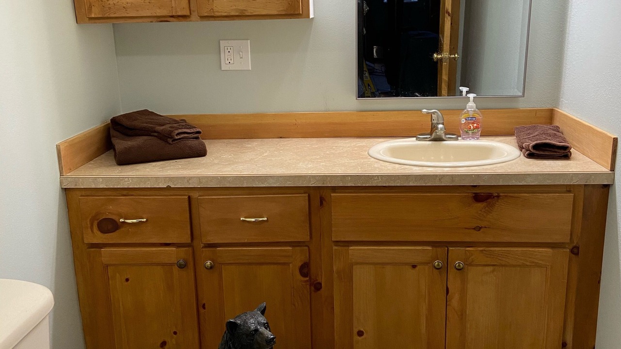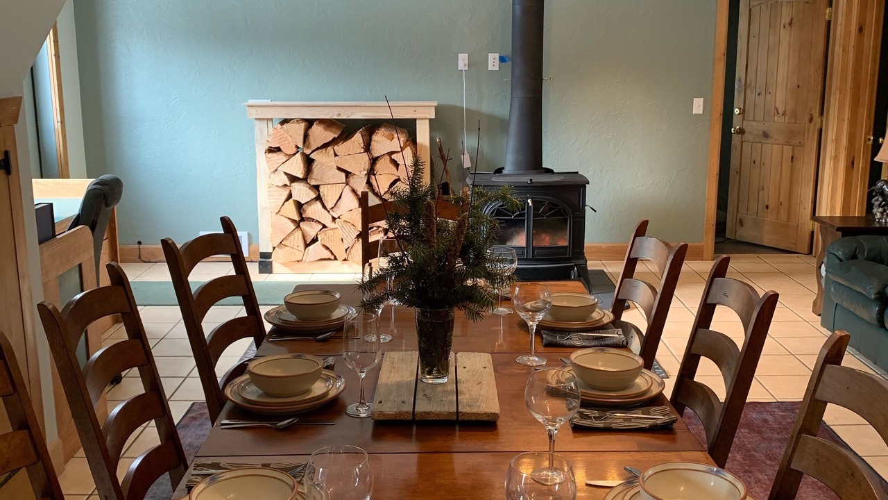 Largest kitchen in the house, equipped with an full size refrigerator, stove, dishwasher, microwave, coffee pot, toaster, crockpot, pots/pans and dishes for a large group. Large half bath off the large living/dining room with smart TV. Large upstairs room with one queen and 4 twins beds, a comfortable leather couch and playroom, a full bath with walk in shower and a sitting deck overlooking the back woods. Sleeps 6