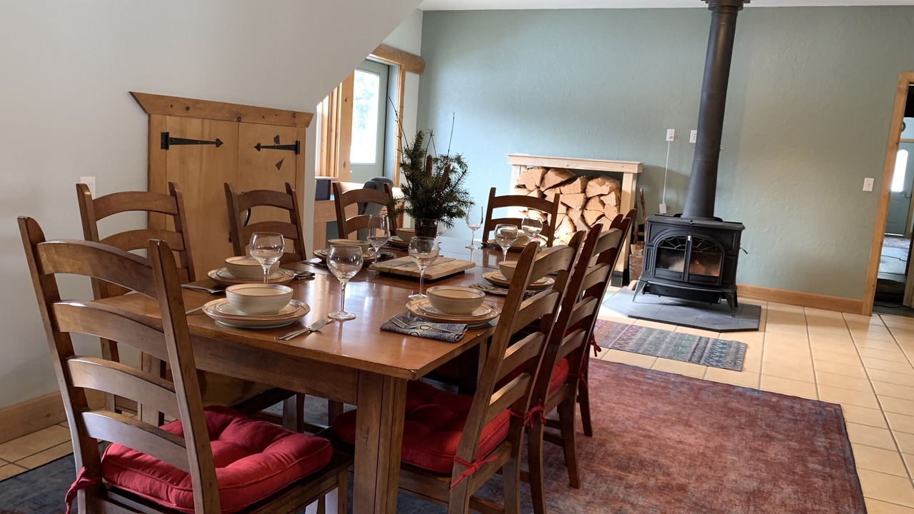 The back patio space, off the main kitchen, has three picnic tables, seating for a large group, a bbq grill and firepit all backing up to a beautiful view of the trees and forest on the edge of Glacier National Park.