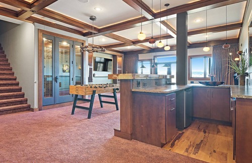 This spectacular and expansive Ranch is nestled away on almost 200 acres, with breathtaking panoramic views of the Black Hills, Bear Butte, Terry Peak and the vast prairie, in South Dakota. Offering 8128sq.ft. of living space, with 7 bedrooms, 4 full baths and 2 half baths. The main level is flooded with lots of natural sunlight, with an open living room area that features a 2-storey stone fireplace, a large elegant dining area with a table that seats 14, and a beautiful open gourmet chef's kitchen, fully equipped and centered around a huge island, includes top-of-the-line 'Wolf' stainless steel appliances, including a gas range cooktop with duel ovens, a range hood and pot-filler faucet, 48” Sub-Zero refrigerator/freezer with French doors, wine fridge, two dishwashers, three sinks, custom cabinetry, all draped in gorgeous granite countertops, perfect for entertaining and brings everyone together in the heart of this villa. This ranch also features a games room with a billiard table, foosball and a custom wet-bar, a hobby room, library, office, exercise room, wine cellar, movie theatre, private vanities in most bedrooms, steam shower, extensive patio and deck space with hot tub and fire pit, luxurious stone and granite finishes, two story ceiling, Wi-Fi and TV's and designed with luxurious “Urban-Ranch” style furniture and décor. Also, includes an attached 3+ stall garage that is finished with built-in storage. 4-wheel drive is mandatory during the winter months and recommended year round. This property also has a detached 40x80 Shop that is fully finished, heated and includes a 700 sq. ft. loft apartment, with a King size bed and couch (sleeps 2) for an additional rate.
