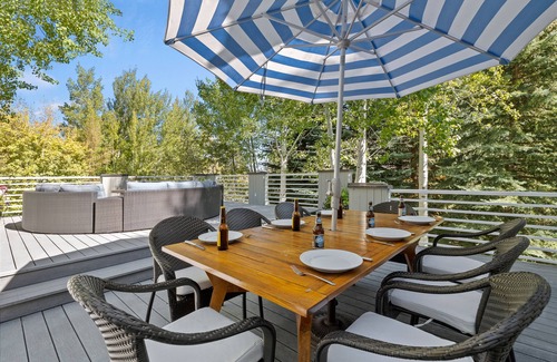 A magnificent 800 square foot deck Is located off the Great Room, complete with a BBQ, dining for 8 and a large wraparound outdoor couch. The deck is tucked high up in the aspen trees and provides stunning views of the Tetons. Whether you want to relax underneath the stars or entertain your entire family this deck always creates the perfect atmosphere.