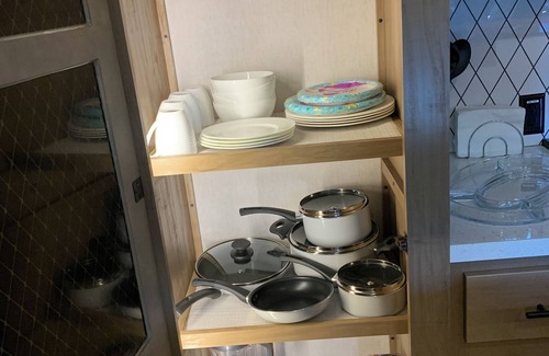 The master bedroom features a slide-out queen Bed, dresser and wardrobes, and private rear bath. The master bathroom includes a large shower with sliding glass doors and seat, dual sinks, porcelain foot flush toilet, and plenty of storage. There is also a second 1/2 bath off the kitchen! Wake up, enjoy a cup off coffee overlooking some of the best things Montana has to offer. Come to Glacier for the recreation, stay with us for the rest!