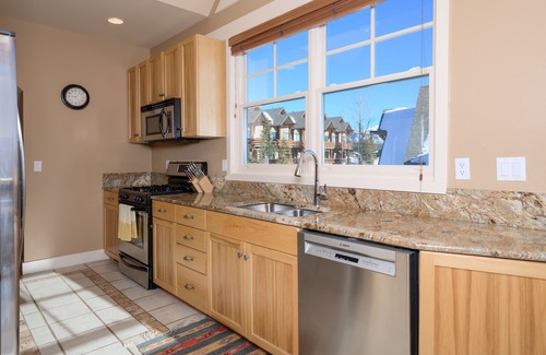The main floor offers a gourmet kitchen with granite counters, stainless steel appliances, breathtaking views, and everything you need to cook the perfect meal. With this direct, slopeside location, you can easily ski-in for lunch or a cup of hot chocolate and warm up while sitting by the cozy, gas fireplace. You can watch all the action from the large, open living room with double decks with outdoor seating, a brand new Weber gas grill, and direct views of the slopes. The separate dining area opens to the living room and seats 6-8.