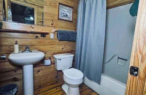 This cabin is small and compact, but really cute and roomy for its size. The bedroom downstairs has 1 queen size bed and a small loft with 2 twins. Covered front porch with a nice back deck with a Hot Tub and a wooded view. Less than 5 Minutes walk to the Ouachita River!