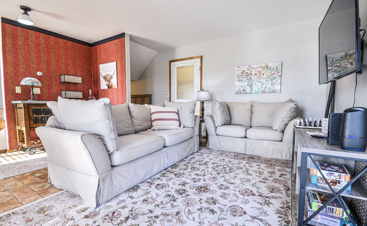In the master bedroom on the main floor by the kitchen, you’ll find a California king bed and charming overstuffed armchair with ottoman under a ceiling fan. Wind down to sleep watching the 50” ROKU TV. A closet provides storage. You’ll love the convenience and comfort of the Master bedroom’s ensuite bathroom with Jacuzzi tub. A desk is available for remote-work needs.