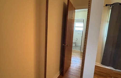 The bathroom is located on the upper level. The washer and dryer are located on the lower level.