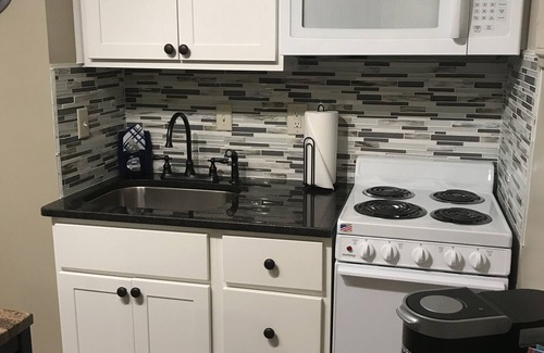 This cozy apartment enters through a shared hallway and has been recently updated from floor to ceiling with new cabinetry and renovated kitchen and bathroom. Kitchenette with full refrigerator, apartment size stove, microwave, granite counter tops, and Keurig coffee maker. Kitchen is supplied with basic cooking supplies and dishes. Full bath with shower unit. Desk and comfortable office chair are also available in the apartment to accommodate our business travelers. Wifi is available throughout the unit. Washer and dryer are located right outside of unit in central hallway.