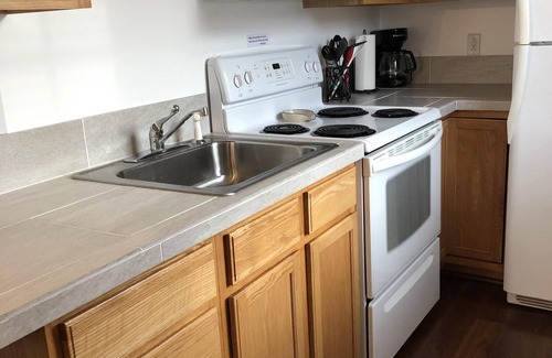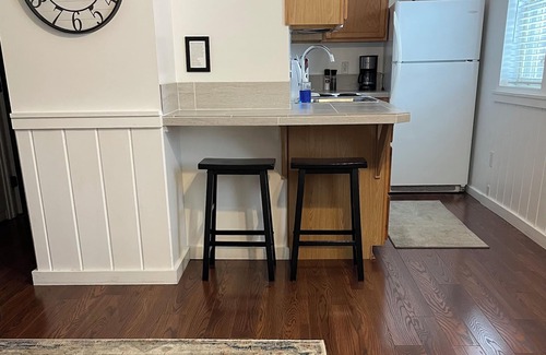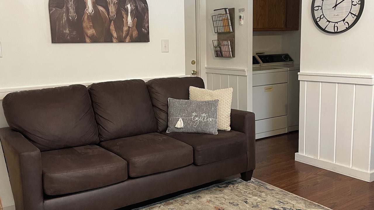 Sunset Apartment is located out in our barn on the far right. It has 2 bedrooms on the second floor, (with a staircase) one bedroom with a queen bed and one bedroom with a full bed. It will sleep 4 comfortably, but we do allow 5 people. It has 1 bathroom on the main floor with a tile shower. Just outside the bathroom is a washer and a dryer also a closet with a cot, folding chairs, games, magazines, and extra pillows and blankets. We provide towels and linens. There is a fully furnished kitchen a small table with 4 chairs, a bar with 2 stools. The living area has 1 couch. Complimentary coffee and a few snacks.