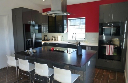 The European-modern kitchen with island seating is a well-equipped place to gather, whether simply making plans for the day over breakfast, lining up wine glasses and snacks for an afternoon nibble, or preparing a savory dinner (feast) for friends and family.