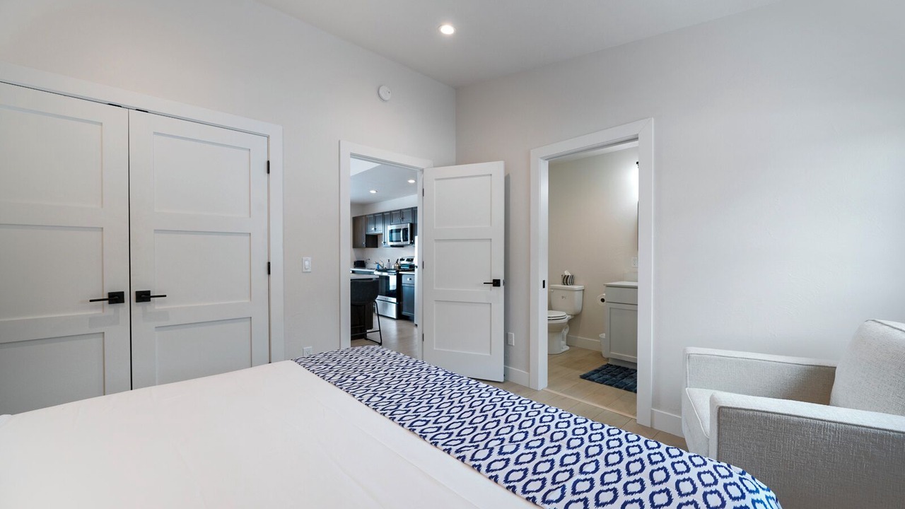 This unit is a one-floor design with a King Master bedroom and Full bath, tastefully furnished and suitable for families, groups of friends, or couples. The unit accommodates up to four, with the living area providing a comfortable Queen sofa bed. Each unit is fully equipped with Heat/AC, a full kitchen with granite countertops, and an eating bar with four bar stools. The living area offers a streaming large-screen TV, two outdoor front porch chairs, and a table for the Guests' enjoyment. The Primary Bedroom has a king-sized bed where you can retire after a fun-filled day and dream about the next day's adventures. The units are also guest or family friendly as the Queen pull-out sleeper sofa offers sleep for two. The communal area provides barbecues, a large gas fire pit in the central courtyard, and common coin-operated laundry machines that all guests are welcome to use. It is located on the lower level of the Cottages building. The laundry area has an electronic lock and is open 24/7. Additionally, units one and two, three and four, and five and six offer common lockable doors between each unit, so you can book a 2BD/2BA unit to share space with friends and family, if desired. Please check out our 2BD/2BA listing if you would like to book this accommodation. Parking is provided for all units.