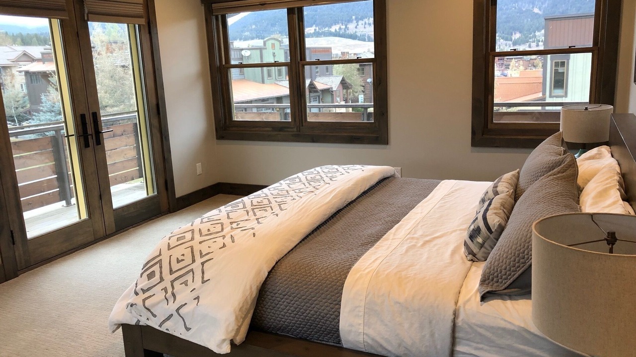 This two level home has a large private outside patio with a Weber Grill, dining table for eating alfresco and Adirondack chairs for relaxing. We have private balconies off two of the bedrooms, all with expansive gorgeous mountain views; large walk-in custom closets; and mountain views from every window. Conveniently located a block from the free mountain shuttle (the Skyline Bus). Walk to restaurants, markets, Town Center fire-pit, movie cinema, skating rink, the free summer concerts, Farmers Market, and all the Town Center events. No need to rent a car if you don't want.