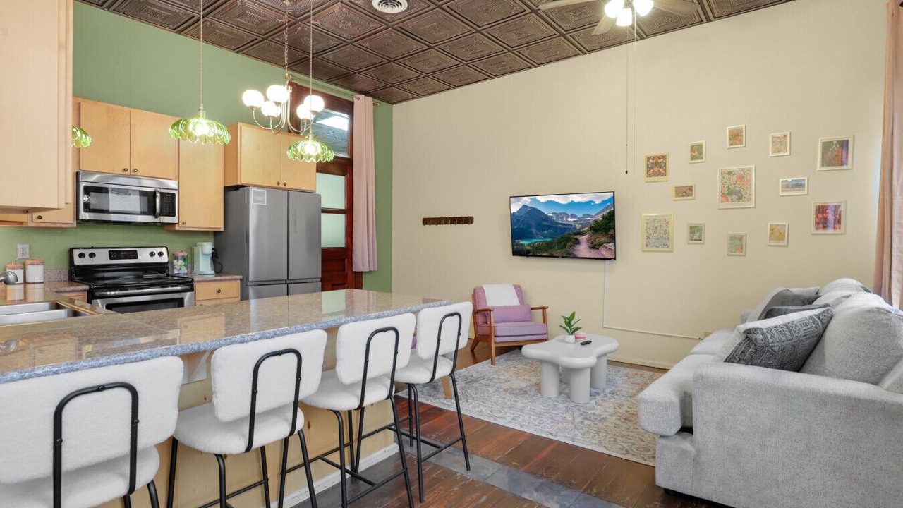 A perfect peninsula counter near the living room where you can eat and watch TV with your friends and family.