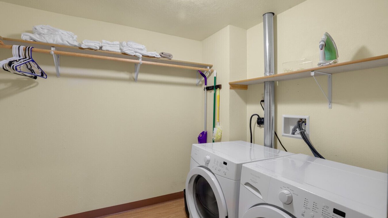 The kitchen area has numerous cooking appliances and spacious countertops and is next to the living room so you can watch your favorite show while you prepare dinner.