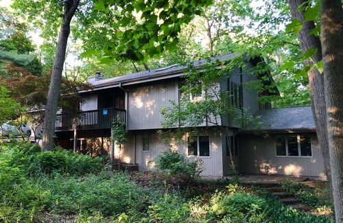 The Sand House is an ideal spot for a vacation with your family, or a getaway with friends. Just 90 minutes from Chicago, this five-bedroom, two-bath summer house on two levels via spiral staircase will provide comfort, fun and memories for all. Just a one-block walk to the beautiful, sandy, private Harbert Woods beach, you can swim, build sandcastles, and watch spectacular sunsets. At the house, have your morning coffee out on the upstairs deck surrounded by trees. The combined kitchen, dining and living room area, with vaulted ceiling, allows everyone to be together, and there is a dining table for ten.