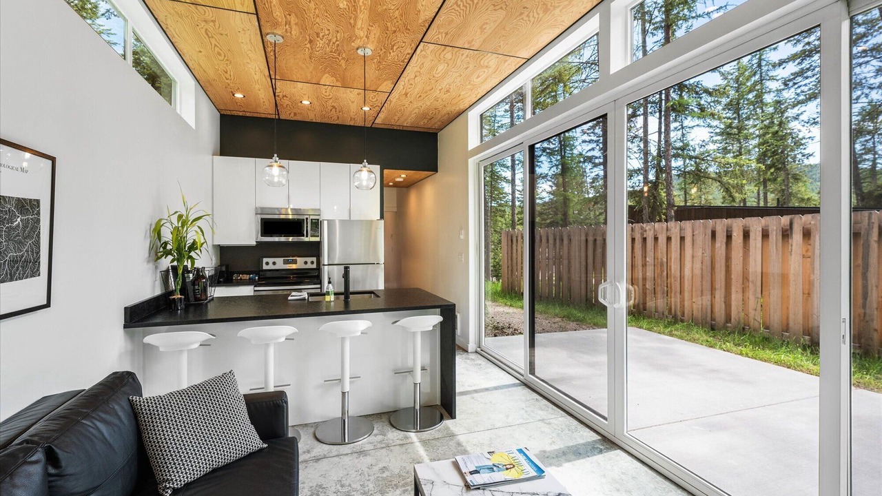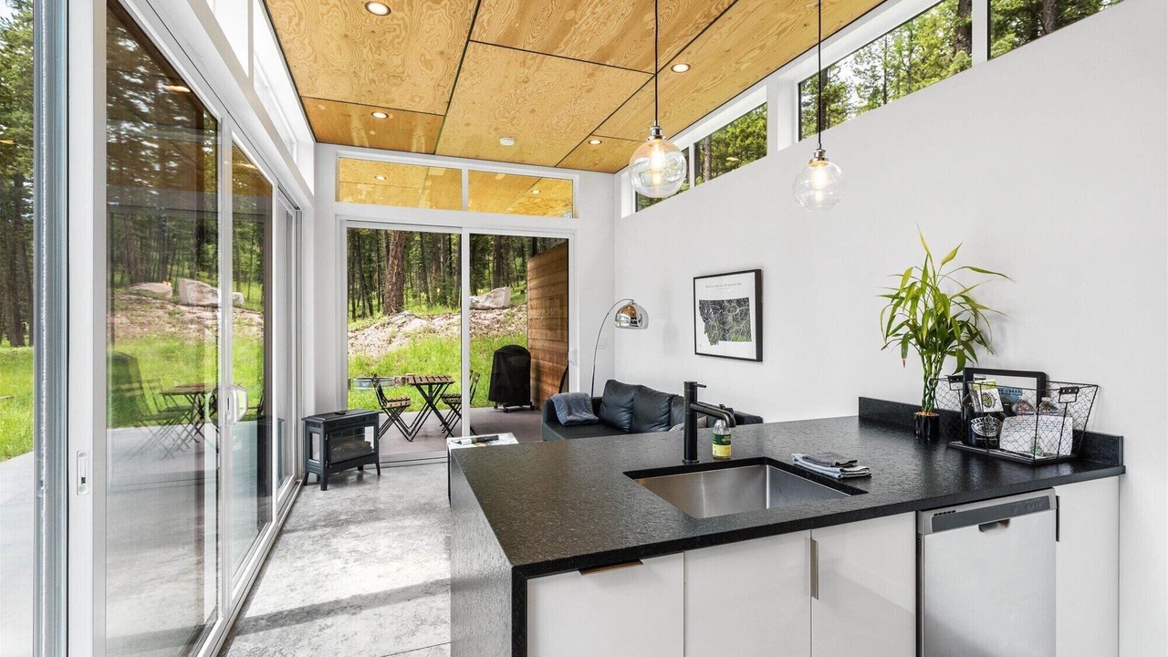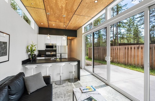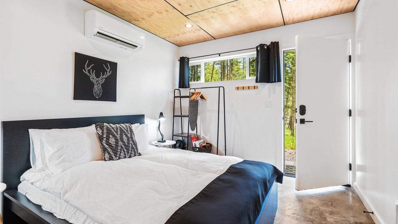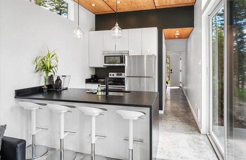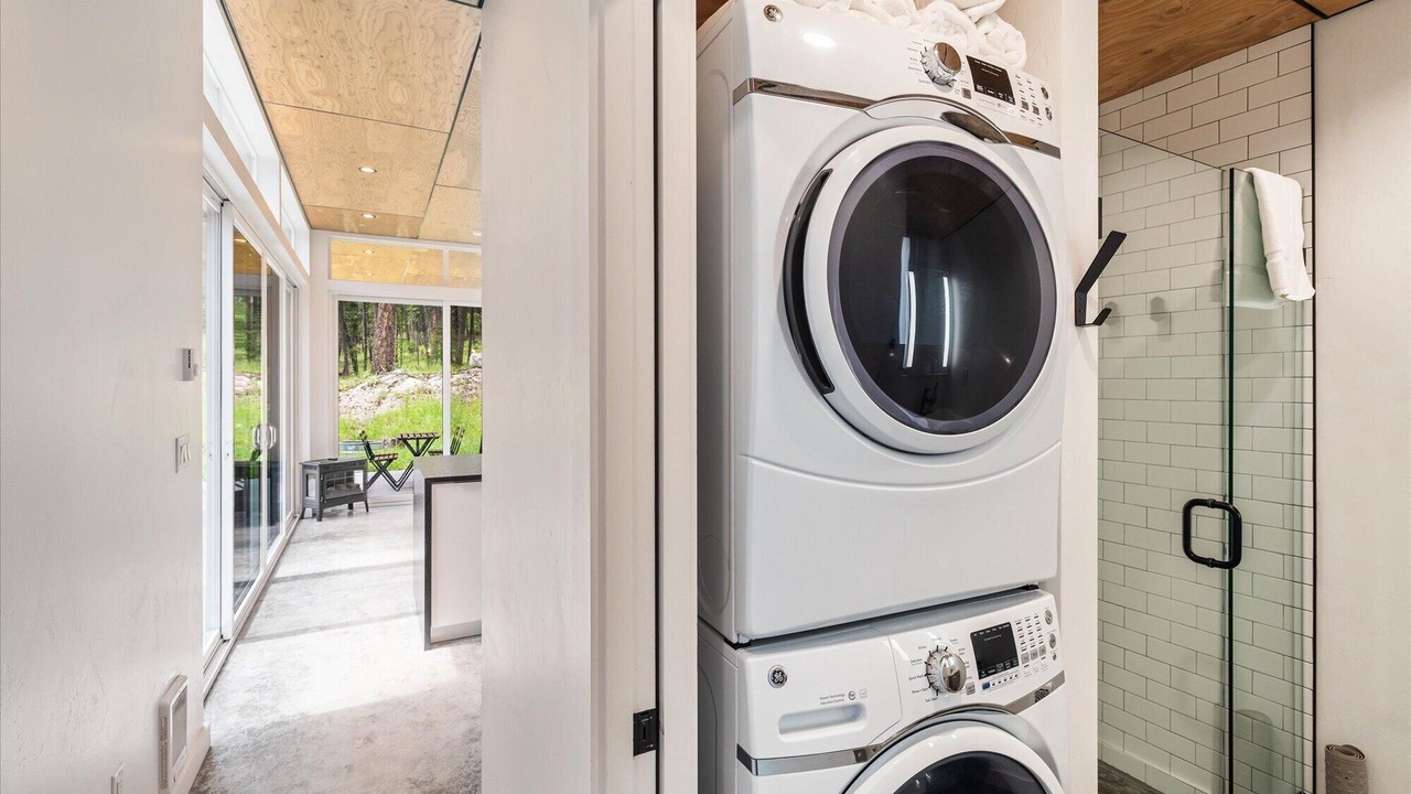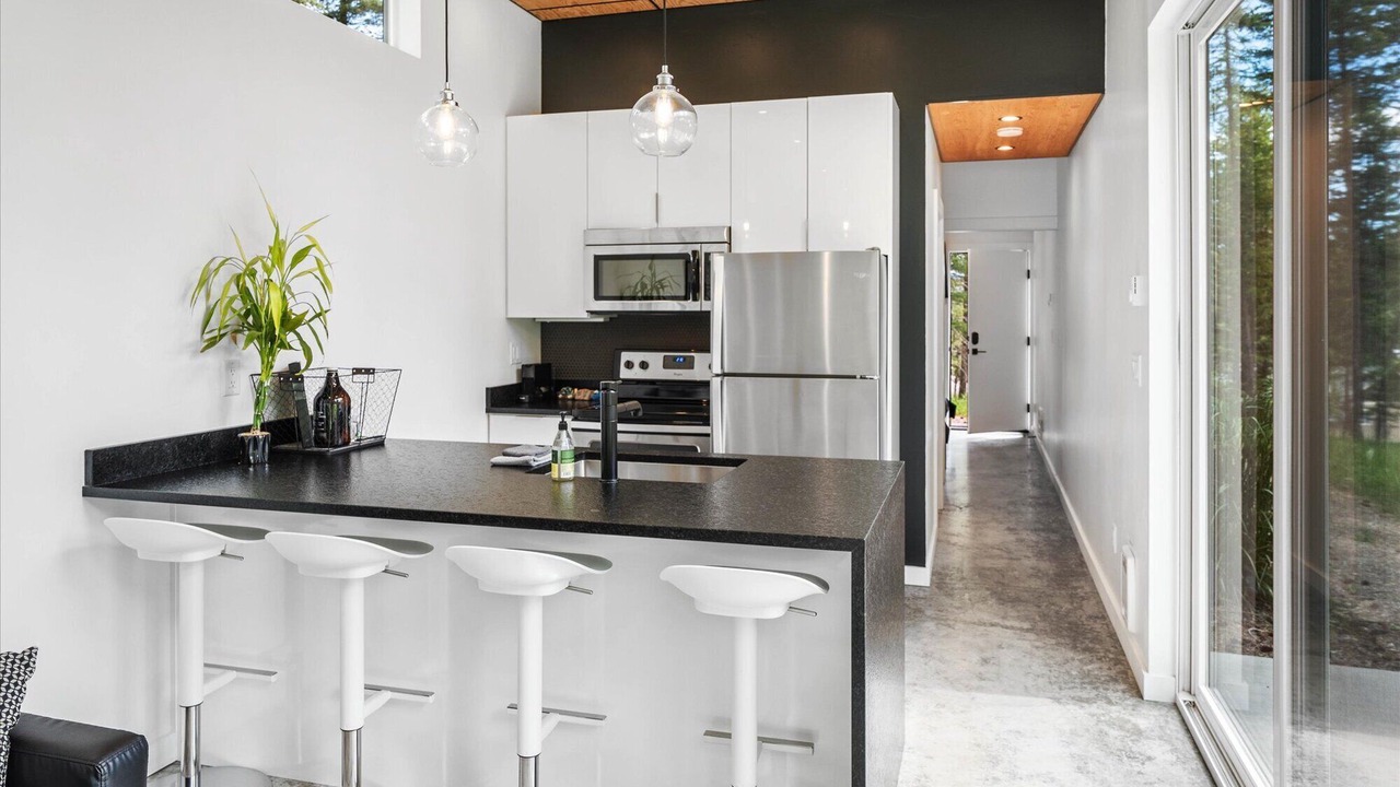 Stoner Creek Cabins offers clean lines, modern efficiency, and thoughtful amenities. Our contemporary design is completed with Shou Sugi Ban siding, a sustainable preservation technique originating in Japan. The cabin may accommodate up to four people with one queen bed in the bedroom and a sofa sleeper in the living space. The open concept kitchen and living area includes floor to ceiling windows with sliding doors that may be opened to experience the woods from the comfort of your couch. The cabin includes everything that you should need to feel at home! The kitchen provides a full-size refrigerator, microwave, oven, dishwasher, and Nespresso coffee machine with all cooking and eating implements. The stacked front-loading washer and dryer includes complimentary laundry pods. Enjoy the outdoor space with a large deck, table and chairs, propane grill, lounge chairs and private fire pit.