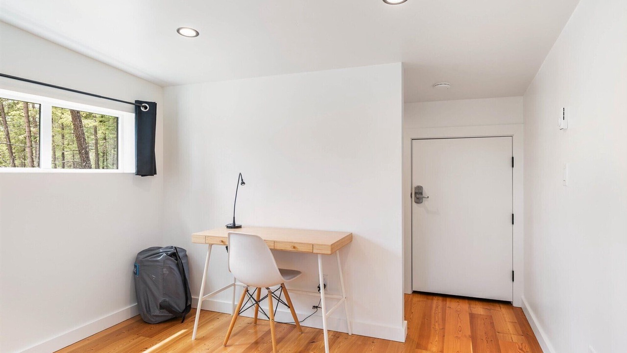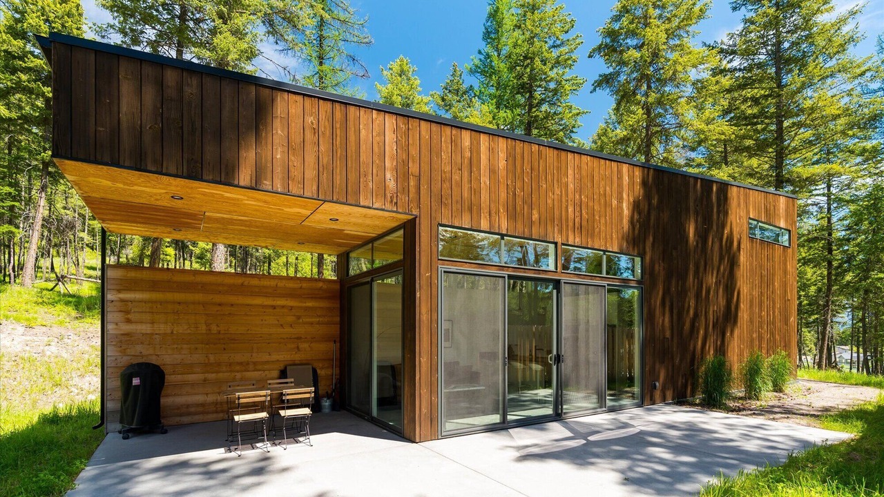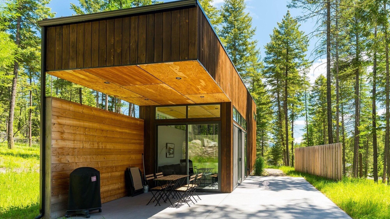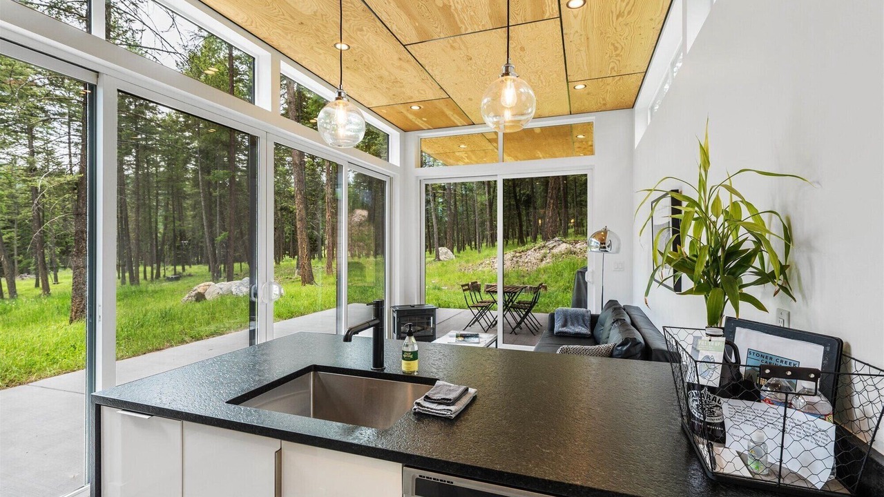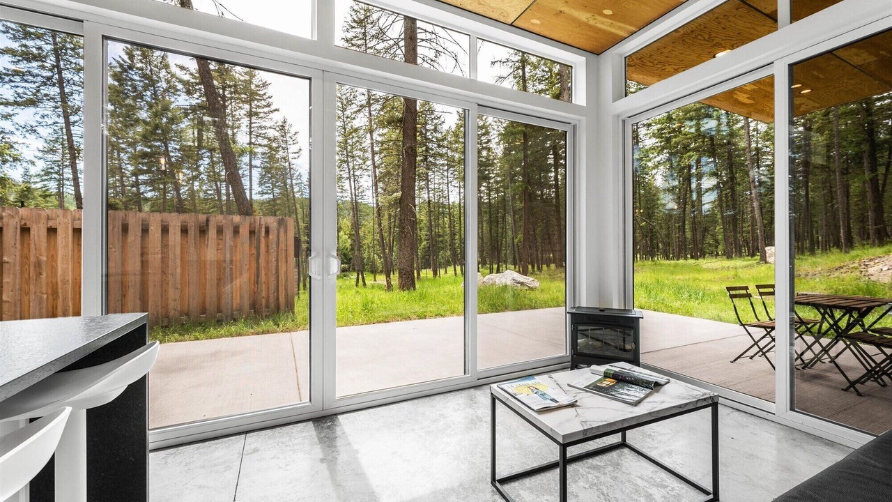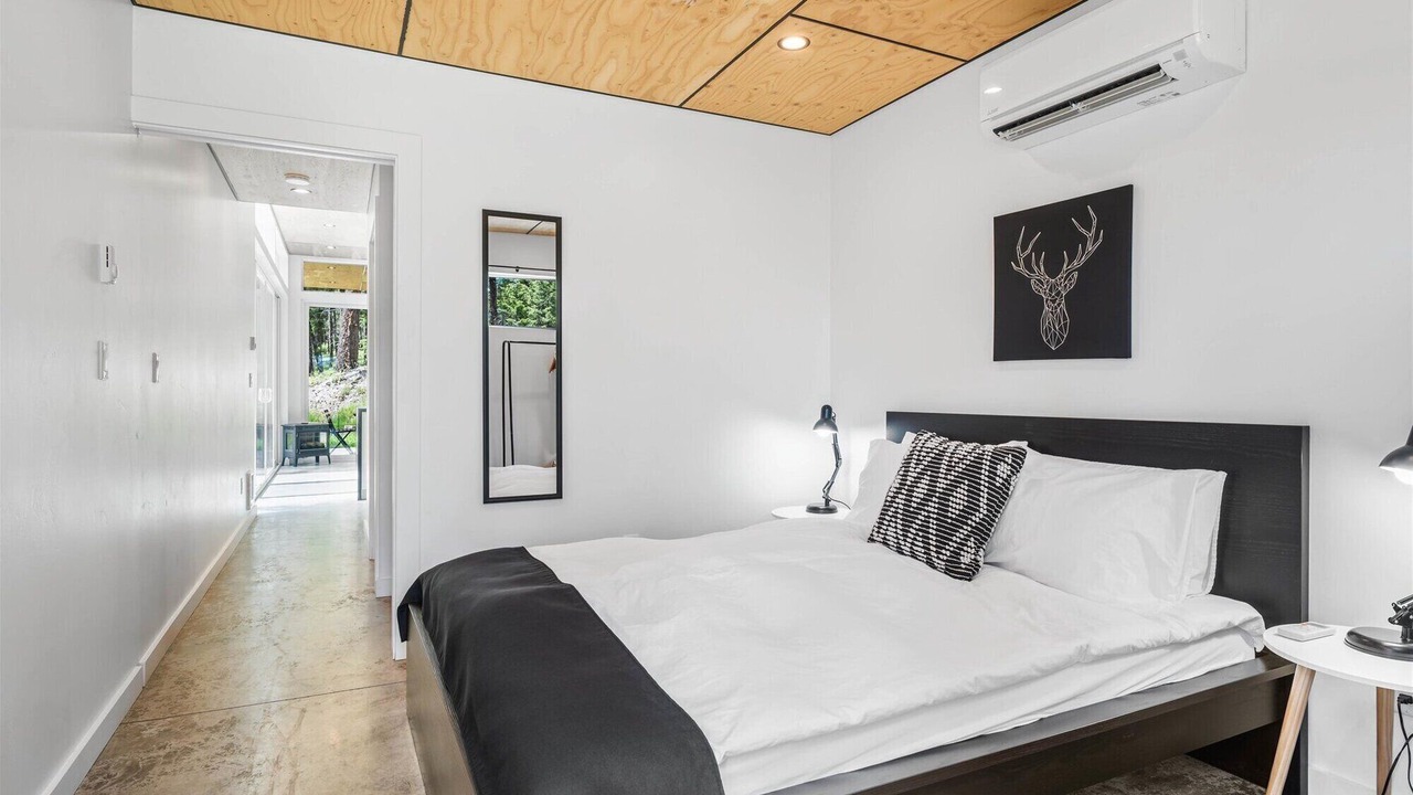 Stoner Creek Cabins offers clean lines, modern efficiency, and thoughtful amenities. Our contemporary design is completed with Shou Sugi Ban siding, a sustainable preservation technique originating in Japan. The cabin may accommodate up to four people with one queen bed in the bedroom and a sofa sleeper in the living space. The open concept kitchen and living area includes floor to ceiling windows with sliding doors that may be opened to experience the woods from the comfort of your couch. The cabin includes everything that you should need to feel at home! The kitchen provides a full-size refrigerator, microwave, oven, dishwasher, and Nespresso coffee machine with all cooking and eating implements. The stacked front-loading washer and dryer includes complimentary laundry pods. Enjoy the outdoor space with a large deck, table and chairs, propane grill, lounge chairs and private fire pit.