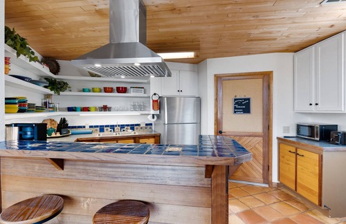 Prepare delicious meals in the open counter-kitchen, featuring charming grandpa-chic tiling. Gather in the open common living room area for fun board game nights or cozy up for movie marathons. Retreat to the vaulted lounging "quiet time" area upstairs, perfect for relaxation, or indulge in the luxury of a jet-tub jacuzzi.