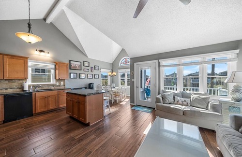 The dining area brings everyone together with a table for six and a breakfast bar for two. The kitchen is thoughtfully stocked with all your essentials, from a Keurig for that first cup of coffee to a dishwasher to handle the cleanup. Whether you're cooking up a seafood dinner or snacking between beach runs, everything is right at your fingertips.