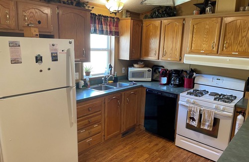 Kitchen is well equipped with most all that you would need to prepare for meals with the family. There is a gas stove, refrigerator, dishwasher, microwave, toaster, coffee maker, Keurig, utensils, dishes, cups and a good amount of counter space!