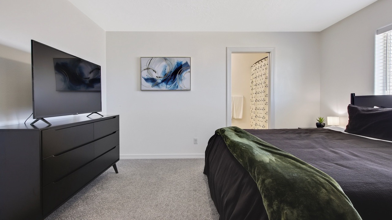 One room with a high end king sized, gel infused memory foam mattress with 2 nightstands, a dresser, a smart TV, and a closet space.