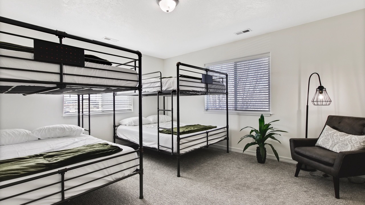 Second room with 2 double queen sized bunk beds with luxurious gel infused memory foam mattresses, a closet, a dresser, a lamp and a sitting chair. The recommended maximum occupancy for this 2 bedroom rental would be 6 people. If you are traveling in a group larger than 6 people, there are more rooms within the home available for rent.
