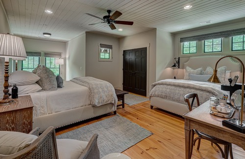 Bunkhouse: One king room; two combination bunkrooms each with a queen bed and bunkbeds. More than just bedrooms, the Bunkhouse is a fully furnished home with a full-size kitchen, living and dining space, and furnished porch with charcoal and gas grilles.