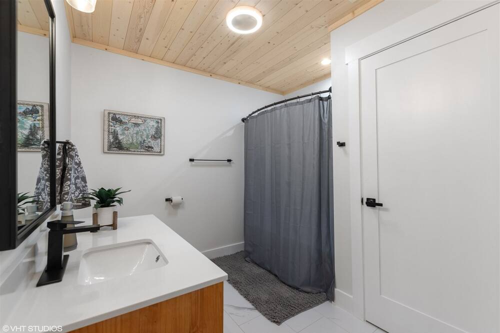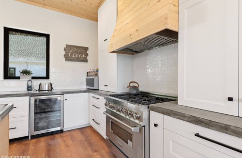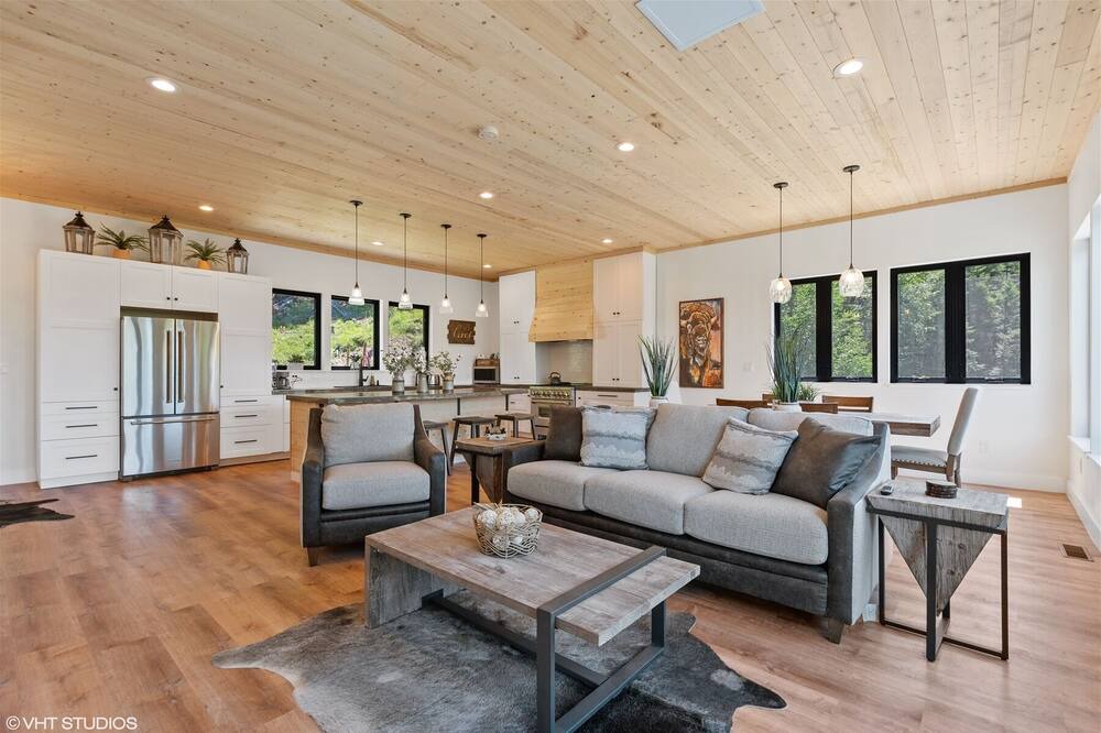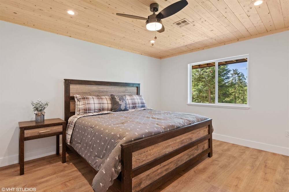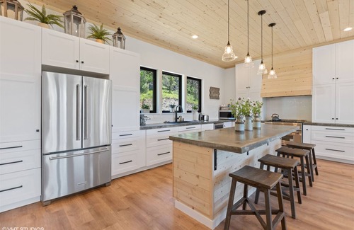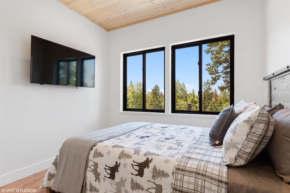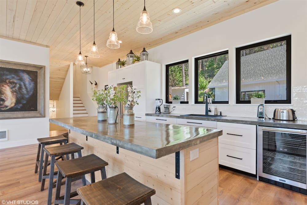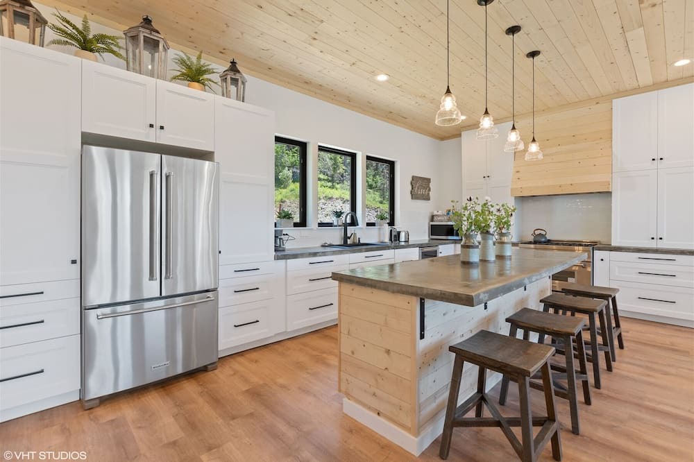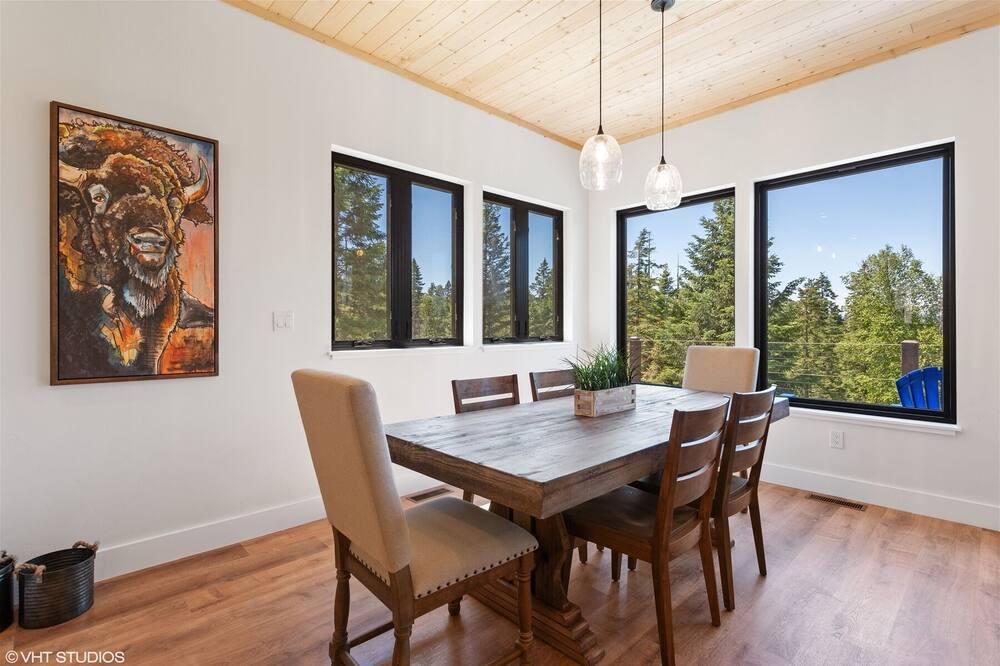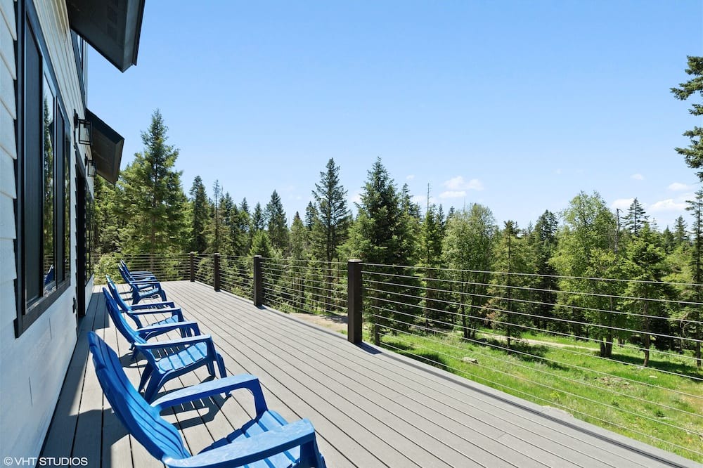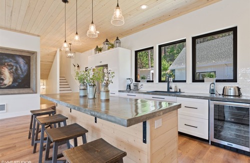 Upon entering this 3-story home, an open great room welcomes guests to the main floor. Accentuated with natural light, large picture windows set the pinewood ceilings aglow. Continuing into the gourmet kitchen with rustic concrete countertops and high-end appliances, culinary connoisseurs will appreciate the wine cooler being near the stove for cooking. Perfect for socializing, the traditional dining table seats 6, while the gorgeous island seats 4 more. The living area lends itself to relaxation and entertainment with a large 65" TV and plush furniture. French doors lead out to a stunning wraparound deck with fresh mountain air and evergreen views. The main-floor bedroom, with its queen bed and private bathroom, is perfect for guests who prefer not to use stairs.