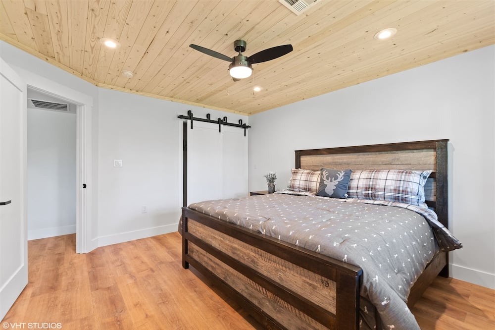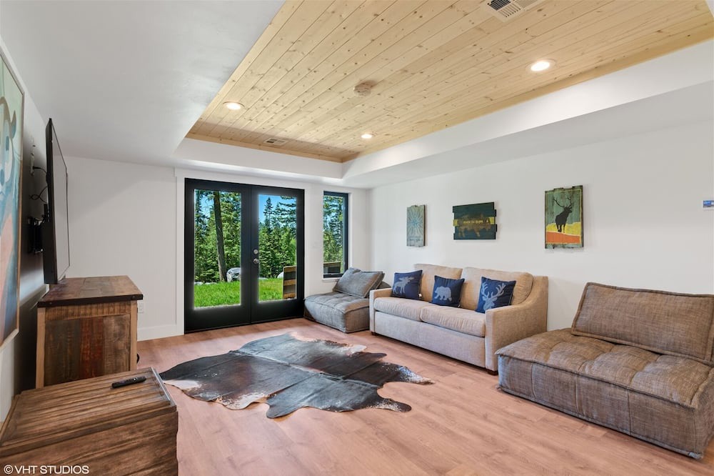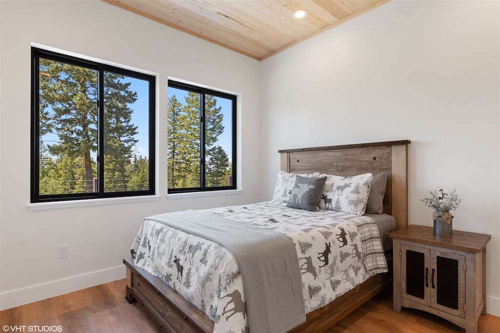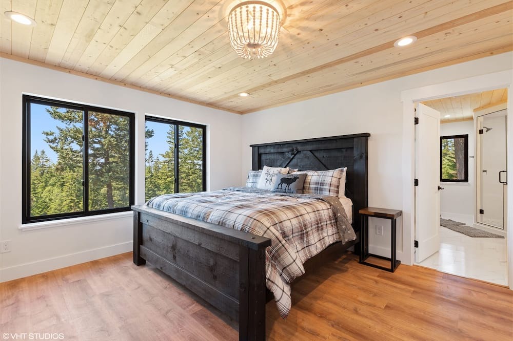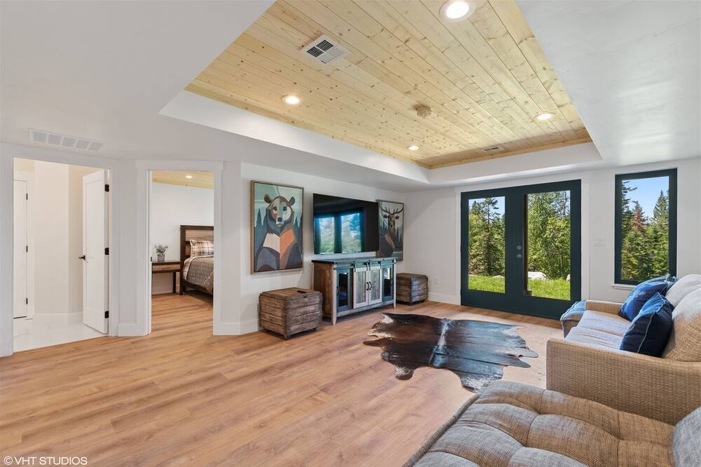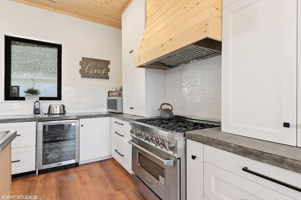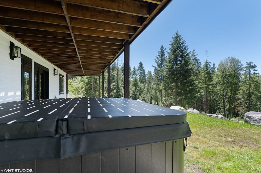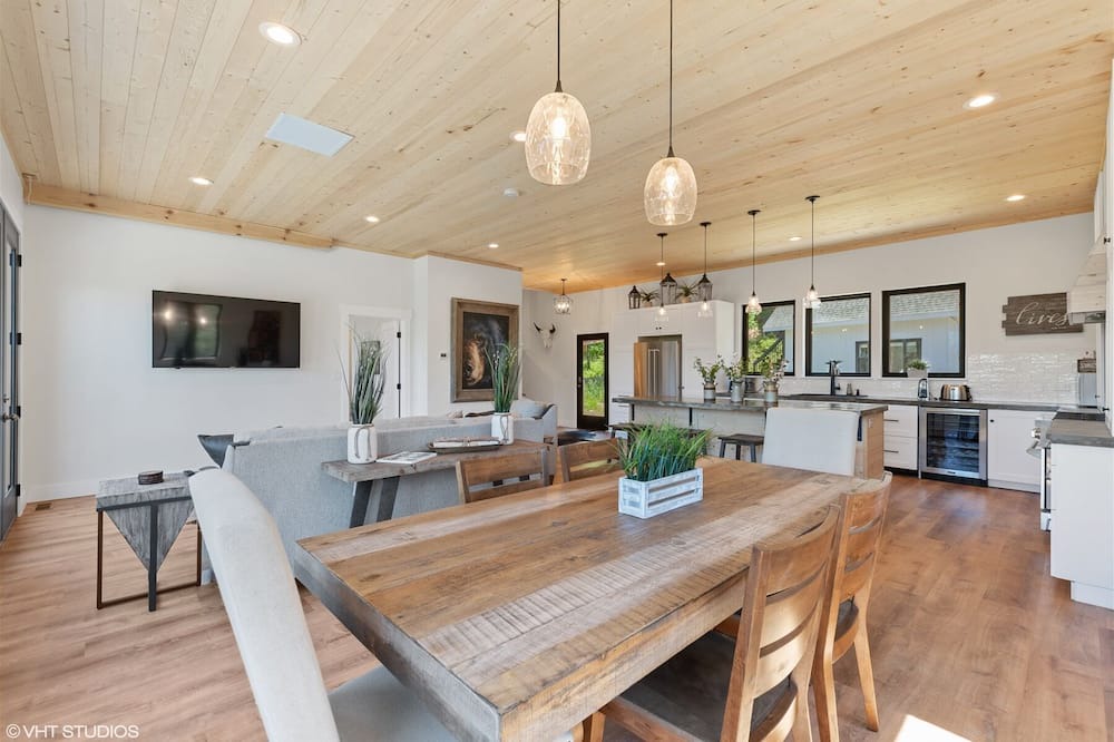 Upon entering this 3-story home, an open great room welcomes guests to the main floor. Accentuated with natural light, large picture windows set the pinewood ceilings aglow. Continuing into the gourmet kitchen with rustic concrete countertops and high-end appliances, culinary connoisseurs will appreciate the wine cooler being near the stove for cooking. Perfect for socializing, the traditional dining table seats 6, while the gorgeous island seats 4 more. The living area lends itself to relaxation and entertainment with a large 65" TV and plush furniture. French doors lead out to a stunning wraparound deck with fresh mountain air and evergreen views. The main-floor bedroom, with its queen bed and private bathroom, is perfect for guests who prefer not to use stairs.