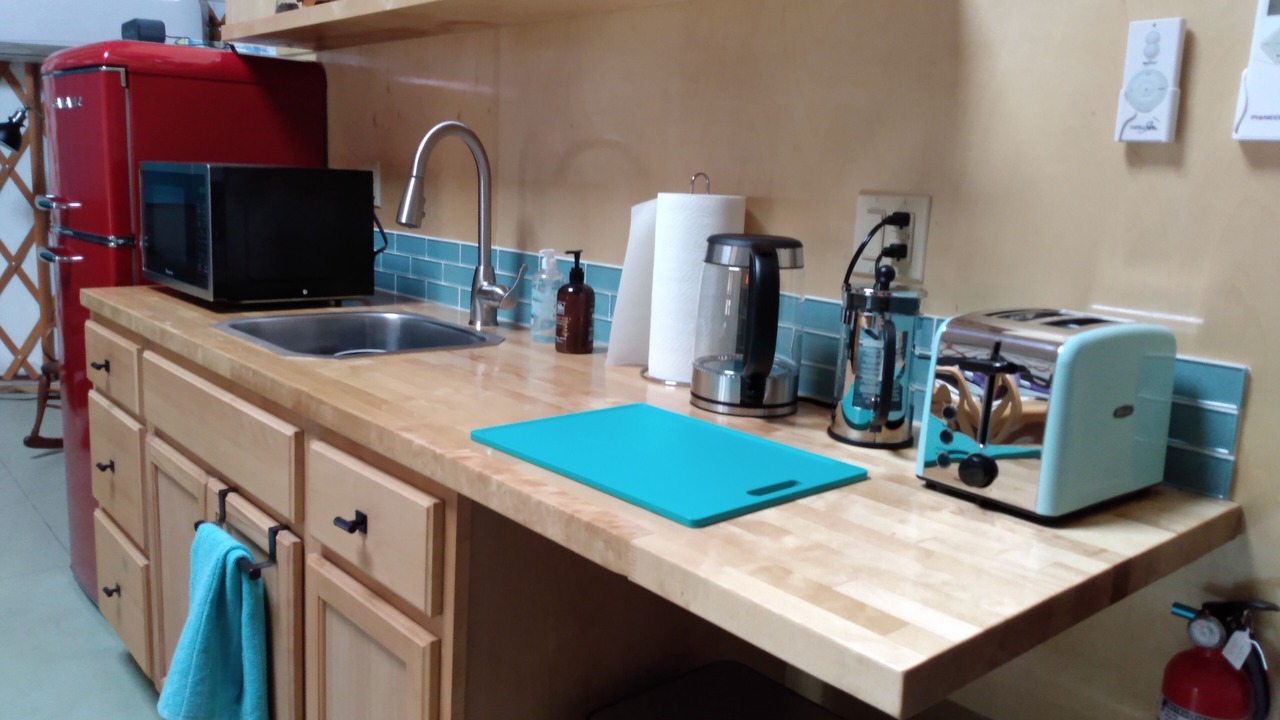 Kitchenette w/ refrigerator/freezer, microwave, air fryer, waffle maker, coffee pot, etc. and everything you need to cook and serve up delicious meals.